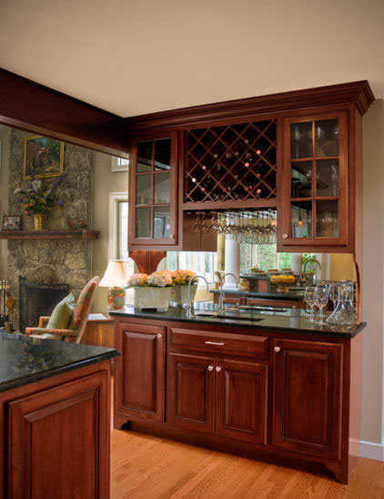 你是葡萄酒的鉴赏专家吗?这种自定义的橱柜方便你存放和拿取葡萄酒,同时在酒吧里安装上镜子会让你产生整个空间更大的感觉。