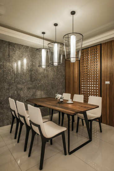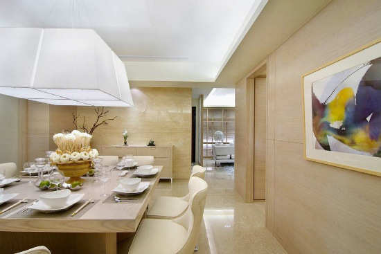编辑点评:以大理石刻沟增添立面层次,木质背墙及餐桌增添用餐时的温馨情境。