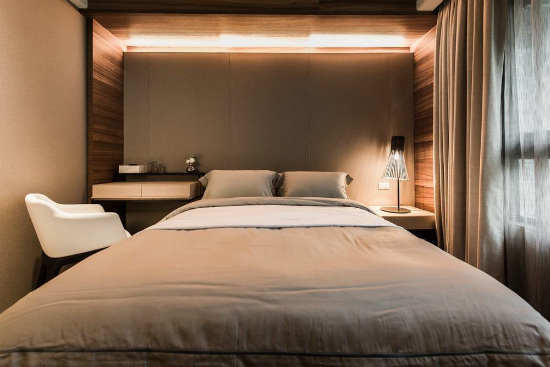编辑点评:将客厅运用木料色块、线状的设计,引述至卧房的柜子结构,同步释放出无压的睡眠氛围。