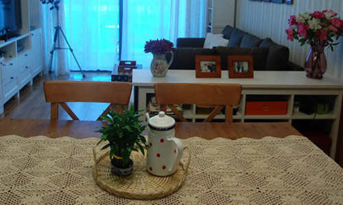 格子桌布让餐厅充满清新甜美的田园气息,而客厅墙上的水墨挂画则是为客厅增添了几分时尚大气,两者之间仅由黑色收纳柜隔开,增大了空间的视觉效果。