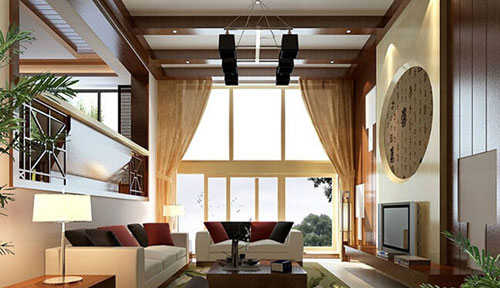 挑高空间的客厅中,以具有立体凹凸感的正圆形来作为电视背景墙,正圆内印有书法字样,顶部的棕红色横梁与独特吊顶为这间客厅增添了不少时尚感,而沙发后的墙面更是打造成开放式格局,让整个空间看上去既显层次感又显得大气。