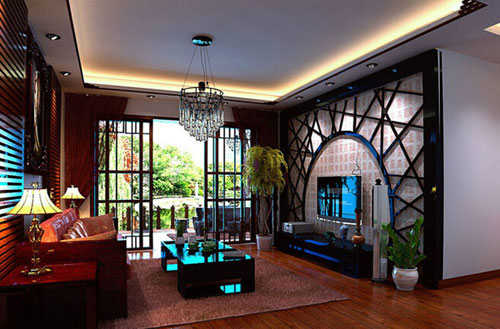以大半圆形与纵横穿插的线条组成的一整面电视背景墙,浅色与深色的叠加,造就了这间客厅的时尚古典气息,顶部的水晶吊灯则更为这间客厅增添了精致感,客厅旁的木框玻璃双开门给予这间客厅足够的自然采光,而沙发两旁的复古台灯让这间客厅更显出一份复古风情。