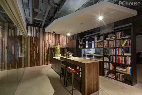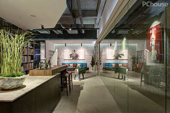 编辑点评:置身于这个空间中,跃层式的吧台与绿色盆栽的结合,透过人与空间的互动因子,拉近了生活与工作之间的距离。玻璃反射出的元素,在视觉上形成了一个全新而巧妙的画面。