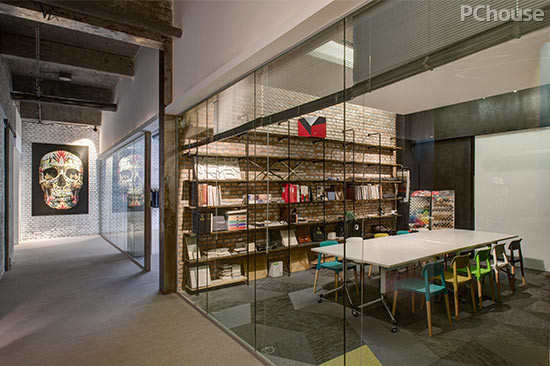 编辑点评:铝合金玻璃内还“装”着一个小型会议室。颜色多变的椅子整齐安静地排列着,错落有致的书籍资料摆放在黑色铁质架子上,没有过多的修饰,简约而不简单,体现了Design plus“设计之于设计”的概念,也营造了一个与众不同的四方空间。