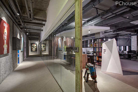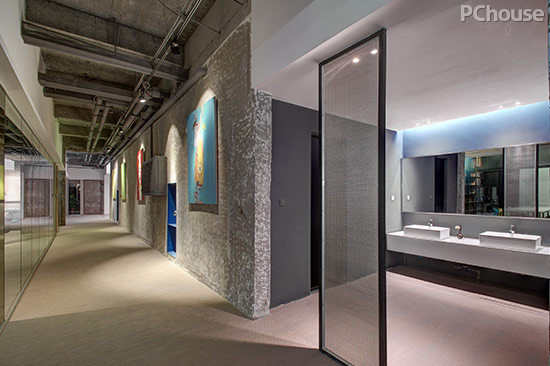 编辑点评:走廊部分同时为艺廊,将天花的管线重新整理、墙面的油漆刮除,呈现空间原有架构,而另一侧则以铝合金玻璃作为办公室隔间,同时对比牆面的粗糙感,并以倒L造型白铁皮处理砖墙段面与天花结构。