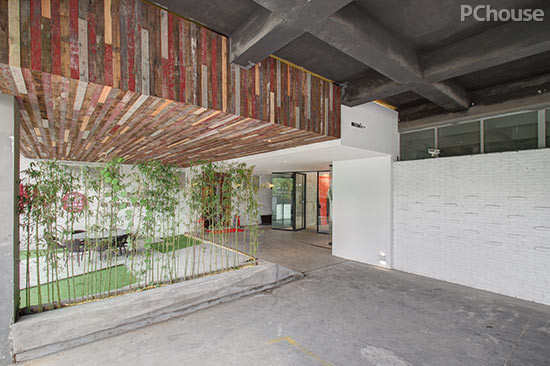 编辑点评:小面积的绿植应用于入口区域,清爽而稀疏的绿色让人一见倾心,而木纹天花与混凝土天花做了对比状的拼贴,形成隔而不断、分而不离的立体效果,并以简洁、环保、轻松的氛围活跃了整个空间。