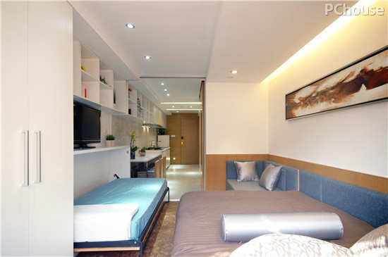 编辑点评:壁柜床的设计更是大大地节省了空间,白天和晚上,卧室是两种不同的状态。同时,小房间新增的洗手盆避免了洗漱拥挤的困扰。
