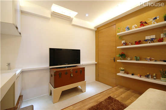 编辑点评:走廊另一边的小房间则完全变成了儿子的小天地,设计师旧物改造,用旧的木箱改造成复古风的电视柜,打开后是一个喜欢模型的男孩世界。
