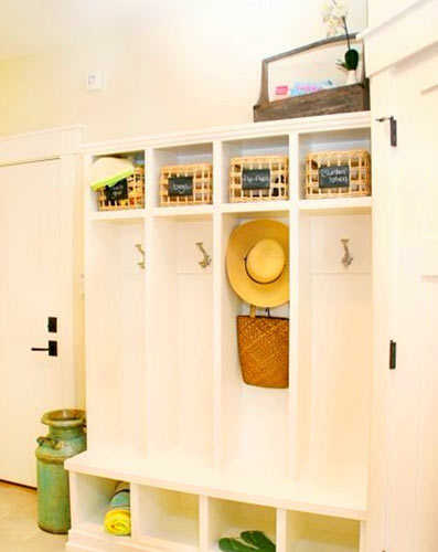 在玄关内放入多个大橱柜,分别为2个双门碰顶橱柜,一个矮橱柜,错开摆放,靠于三面不同的墙,值得一提的双面橱柜,底下为镂空设计,可做鞋子收纳。