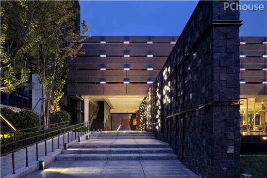 在入口通道一侧以石材和压克利方块叠积木概念的留言墙上,透过LED灯光点亮了亚克力在石块中闪闪放光。