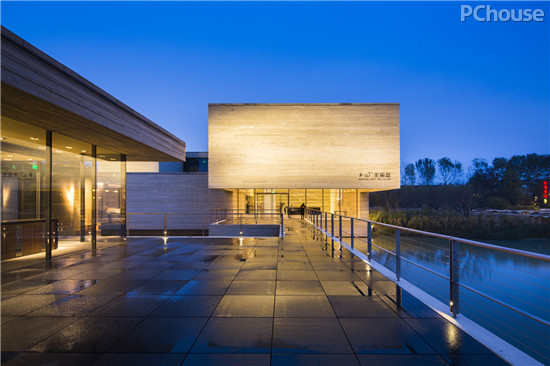 “风啊、水啊,一顶桥。”这是木心临终前看着美术馆设计图说的一句话。摄影师通过长,宽,高三组主要方向的轮廓线,用一点透视的摄影手法,将三五方现代几何造型的外观呈现于镜头之中。横向的不规则表层和均匀的混凝土本色的外立面,在灯照下尽显静态之美。