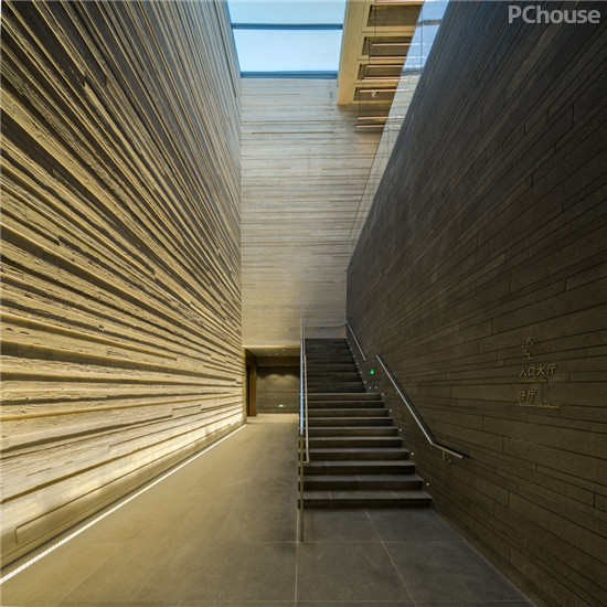 在木心美术馆入口大厅拍摄上,摄影师把握准确的站点,精琢空间构造,近大远小的关系以及透视感跃然呈现在二维平面上。