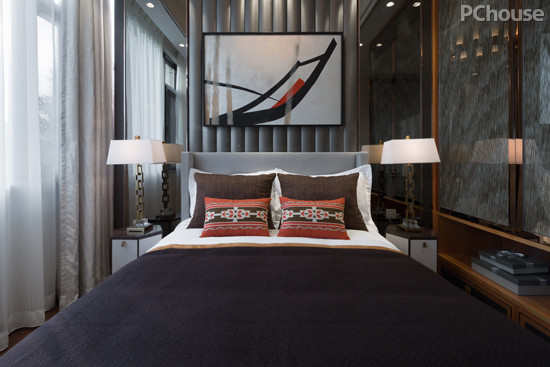 编辑点评:卧室的设计以简洁大气为主,沿袭屋子的主色调棕色,丝绸可让整个房间看起来明亮和有格调,墙壁直接使用花纹和一点儿菱形,看起来有点斯文气。