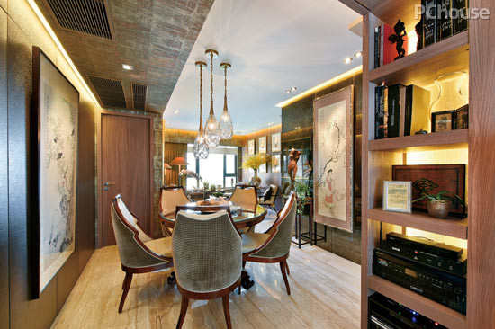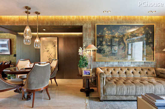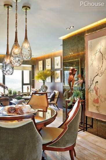 编辑点评:纵观休闲区、餐厅与客厅,现代与古典、时尚与雅致、自然与艺术汇集于一体,设计风格、空间气度统一而和谐。空间面积虽小,但设计师却大胆用料,比如在硬装上设计应用了仿古玻璃、扪布、金属铜片 、木饰面、特色墙纸,大理石等不同材质,多种质感材料混搭的天衣无缝,再配上业主心仪的艺术画,别具高雅韵味。