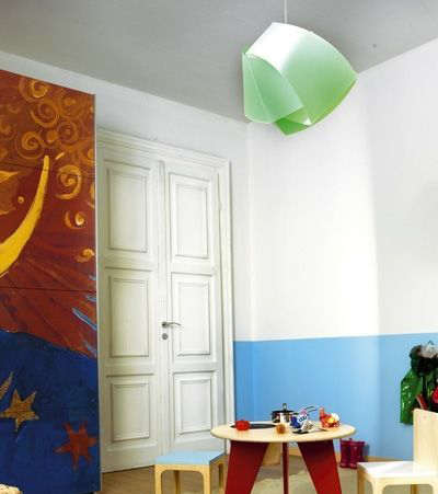 红色的游戏桌搭配各色小凳,再加上一顶薄荷绿色的吊灯,丰富了游戏区的色彩,让孩子玩得更有兴致。