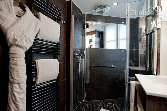 设计点评:贴心的设计在于淋浴房外还增加了浴缸,采用白色的马赛克材质与黑色的瓷砖形成强烈的对比。一个小小的方形区域内,浓缩了设计的经典与舒适。