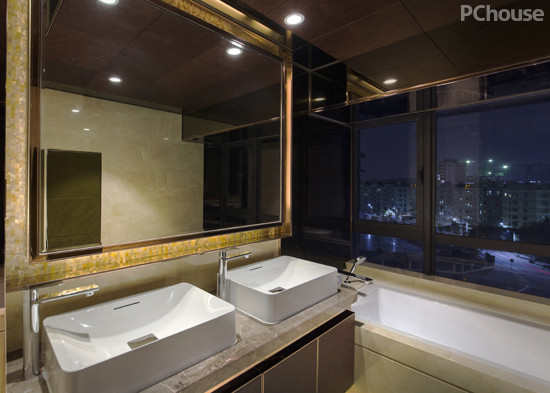 编辑点评:一个大面镜子、两个大洗手台,还有全景视野的玻璃窗,看似粗犷大胆的设计其实是为了让卫浴空间不再阴暗狭窄。有镜子的反射,有窗外的美景,何乐而不为呢?