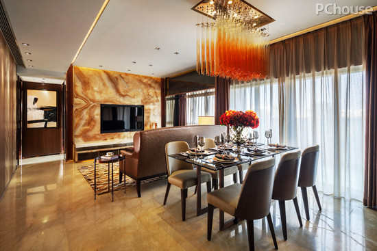 编辑点评:暖色调贯穿于整个空间,法国米黄大理石铺设的地面、天然水纹大理石打造的电视主背景墙、深咖色皮质家具相互呼应,让空间的饱满、厚实感延展到室内空间中的每一个角落,耐人寻味。