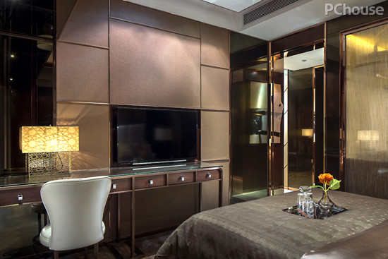 编辑点评:为了让卧室实现多功能化,设计师将电视台和工作台合二为一,完美节省空间的同时也让空间更具连接性。整体稳重深沉的色调也是优质生活的追求。