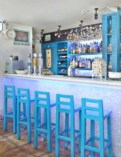 酒吧内以白色为基调,白色的灰泥墙、白色的马赛克、白色的幔帘,一切有如海岸线上的白色沙滩,绵软纯净。海蓝色的桌椅、栏杆贯穿其中,像拍打在沙滩上的浪花,细腻却不矫情。
