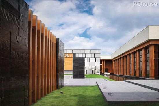 编辑点评:几何体的建筑线条,对称的梁体在玻璃与大理石中穿插,简洁而不失大气。庭院中的树木及草坪,给人以挺立端稳的感觉,很好地修饰了中央建筑的几何边缘。