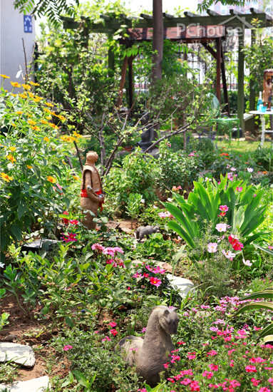 地质台板和椿树分割开了整个花园的每个功能区域。兔毛儿爸爸从世界各国淘买回来的工艺品点缀在植物丛中,充满了异国气息。