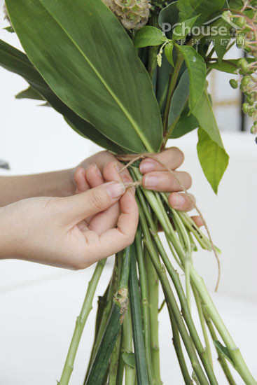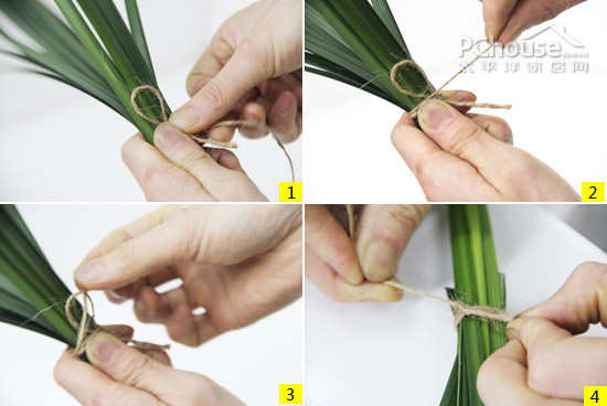 第四步:4-5片完成造型的巴西叶绕出左侧和中间,用麻绳绑紧整体造型。