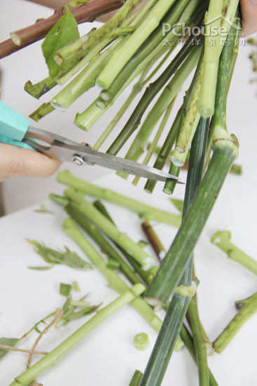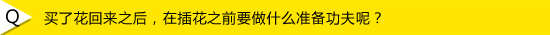 A:做准备功夫是为了让鲜花放更久,而温度和水分则是影响鲜花存活的主要原因。在这里讲两个小方法,第一个,剪切花梗的时候采用斜切方式,这能让切面更大,吸取更多的水;第二个,去除水面以下的叶子,以免腐烂滋生细菌阻碍保鲜。最后当然是注意要勤换水哦。