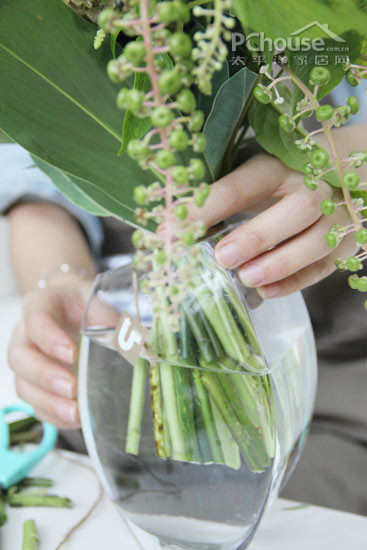 第五步:比量下花器高度,剪掉过长的枝干。用巴西叶环绕,用来遮住麻绳。