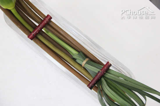 第五步:把春兰叶与睡莲先对应好,放入花器另一头中,同样的也用红瑞木固定。