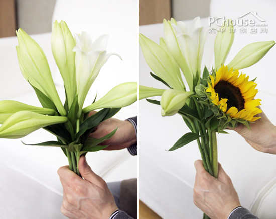 第一步:如图将百合枝干并列摆齐,左手要抓紧,右手则根据百合花苞的形状进行调整。像比较弯曲的可以放在底下做衬托。注意,要留空一侧搭配其他花草。