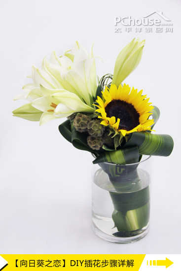 第六步:最后用漂亮的圆头针斜着插入,放入花器中,整个插花就完成了。