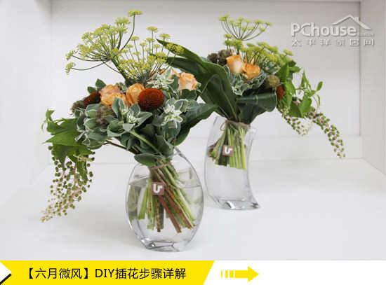 温馨TIPS:叶上花的汁液容易使人过敏,在插花过程中要注意带好手套或选用其他植物代替。选择合适的花器,也很重要,这次花艺师选用的是互补形状的两个花瓶,合并起来能成为一个圆,如图这样反向摆设也更能突显大气。