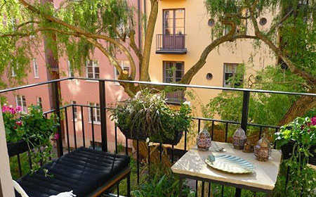 一款宜家风格的夏季小阳台设计,可悬挂盆栽平行有序的置于栏杆上,在极小的空间中毫不吝啬塞入躺椅以及餐台,绿色密集条纹地毯给阳台置入更多线条的同时更显自然味。