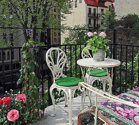 阳台摆放的白色欧式铁艺餐桌与座椅,大大提升了小阳台的品质感,特别是座椅精美的雕饰,周遭放上盆栽,小餐厅很简单就可打造成。