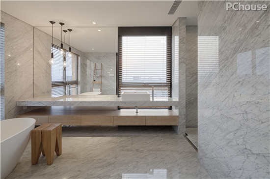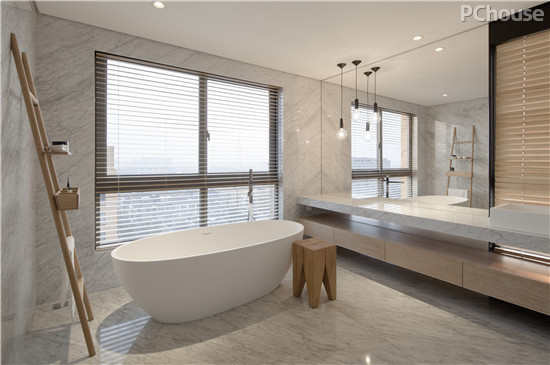 编辑点评:大面积镜面墙使主卫更加明亮光彩。清早洗漱之时,饱览窗外美景,一天的美好就此开启。