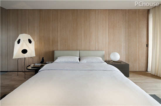 编辑点评:床榻两侧,一侧为简洁的圆几与几何落地灯打造素雅的意境,一侧方形床头柜则为卧室空间增添稳重感。
