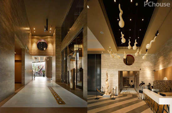 编辑点评:走廊与大厅之间的设计元素与色调搭配,在看似随意间保持着有形地统一与和谐。视觉上的统一,使空间的主体设计风格在入眼时刻既有了定义。长线条的广泛使用,走廊和大厅的纵深感和空间感十分强烈。