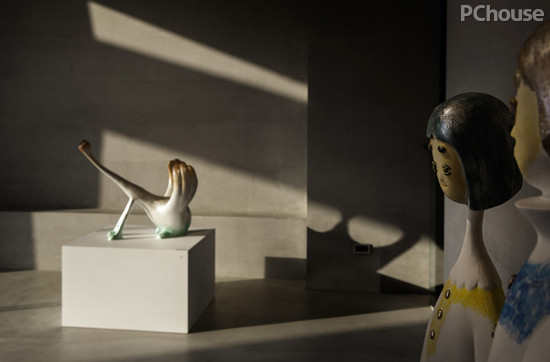 编辑点评:惟妙惟肖的男女雕像立于一侧,细品之下还能感受到女像的面容间的温婉与幸福,男像将脸侧向右侧,似乎带着些许希冀与憧憬,生活中的点滴用艺术手段展现,更立体可观。展示台上的艺术品,则在自然光的映射下美感剧增。