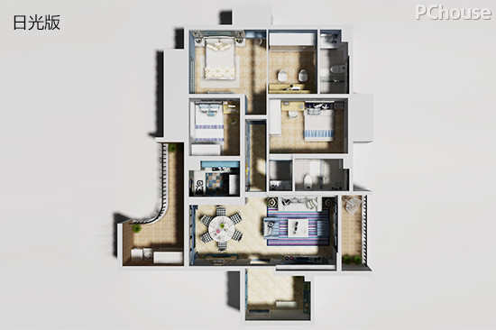 3.充分利用主卧优势,把主卫面积缩小,预留空间设计成衣帽间以及办公区域;