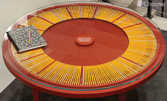 编辑点评:这红色圆形书桌是教育区的一大亮点,底层木板与顶层玻璃之间,夹夹着摆放整齐的铅笔,供给使用,十分方便。