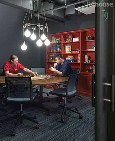 编辑点评:吊灯如即将坠落的水滴,点亮了工业风格的阅览室。整体红黑搭配,沉淀着一丝丝神秘。