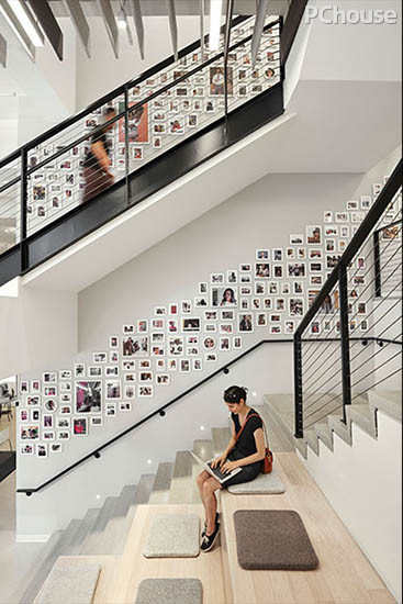编辑点评:简白楼梯墙壁上挂着精彩相片,形成一面整洁的照片墙。原木梯级上摆放些坐垫,又是一处阅读学习的好地方。