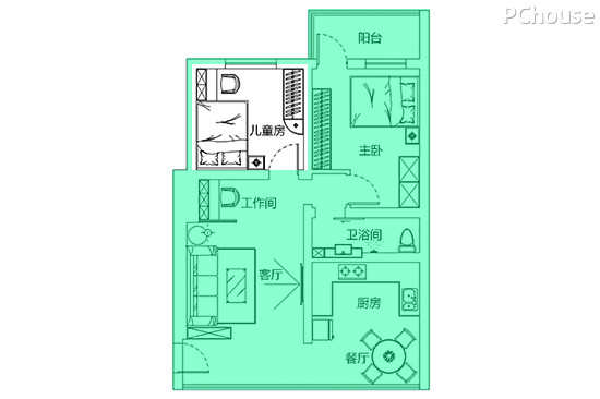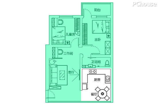 设计解读:餐厨空间是本户型的设计重点,餐厅和厨房设计在同一个空间内,既可以节省空间,又方便日常使用。浅木色橱柜搭配方格墙面,圆形餐桌上摆放盆花作为点缀,让空间显得自然舒适而不落俗套。