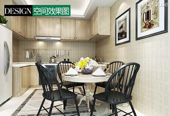 设计解读:整体空间设计干净且明亮,具有强大收纳功能的橱柜设计,还有隐藏式的电器设备布局,使小面积的厨房丝毫不显拥挤。餐椅与墙上的装饰画呼应得当,带来独特的生活气息。