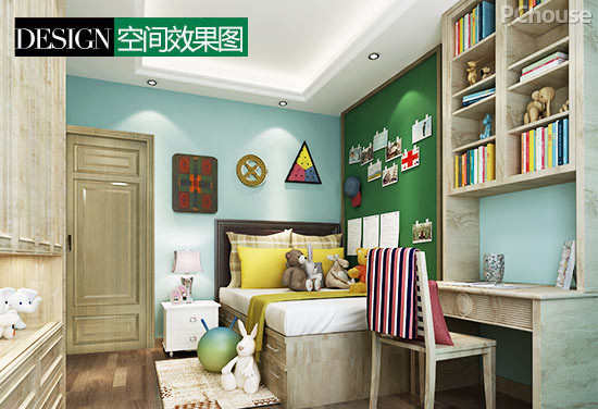 设计解读:小孩一般对周围颜色的反应比较敏感,设计师在墙面装饰上花了不少心思,采用几何形体与冷暖色彩的对比,让空间增添动感,为小孩提供一个自由想象空间。