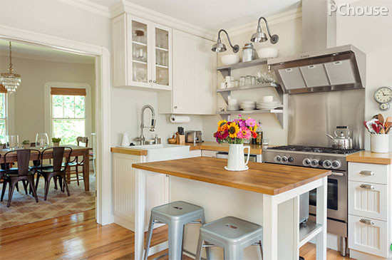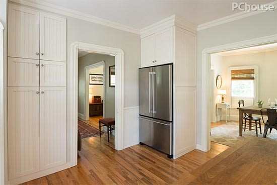 编辑点评:嵌入式冰箱节省了更多的空间,正如一个新的内置储藏室。其中一扇置于墙上的门,引导人进入卧室。其余的门引导人进入地下室。地板采用了红橡木硬木材料,“这鼓舞人心的设计,使得我每天在厨房里干活都感到十分愉悦。”四月说。厨房的改造花费了大概四万元,包括电器、五金,还有结构建造,管道、电力等。