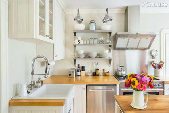 编辑点评:简白墙面、橱柜等装饰搭配原木色,使厨房看起来简单舒适。置物柜向天花板延伸,栅板和玻璃门柜展现的是可见封闭的收纳。金属货架摆放日常用品,使厨房里的日常工作非常方便。一束鲜花摆放中央,成为点缀厨房的靓丽颜色。