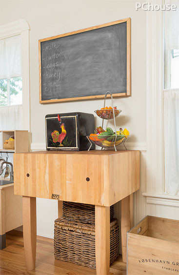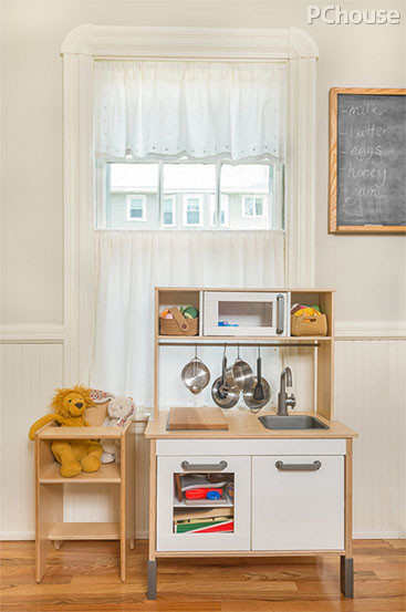 编辑点评:这个由原木色和白色柜门组合而成、犹如调色板一样的组合,是业主二人为女儿打造的迷你厨房。“这是如此的有趣,因为这样的小组合很像我们的厨房;上方还挂着我们女儿的小黑板,”四月说如是。