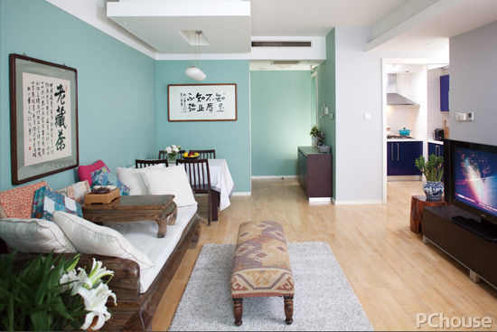 刷新后的客厅加入了湖水绿的元素,与劳务的榆木八宝榻、茶具和墙面的书法十分相配,具有现代的审美又不缺中式的温柔典雅。